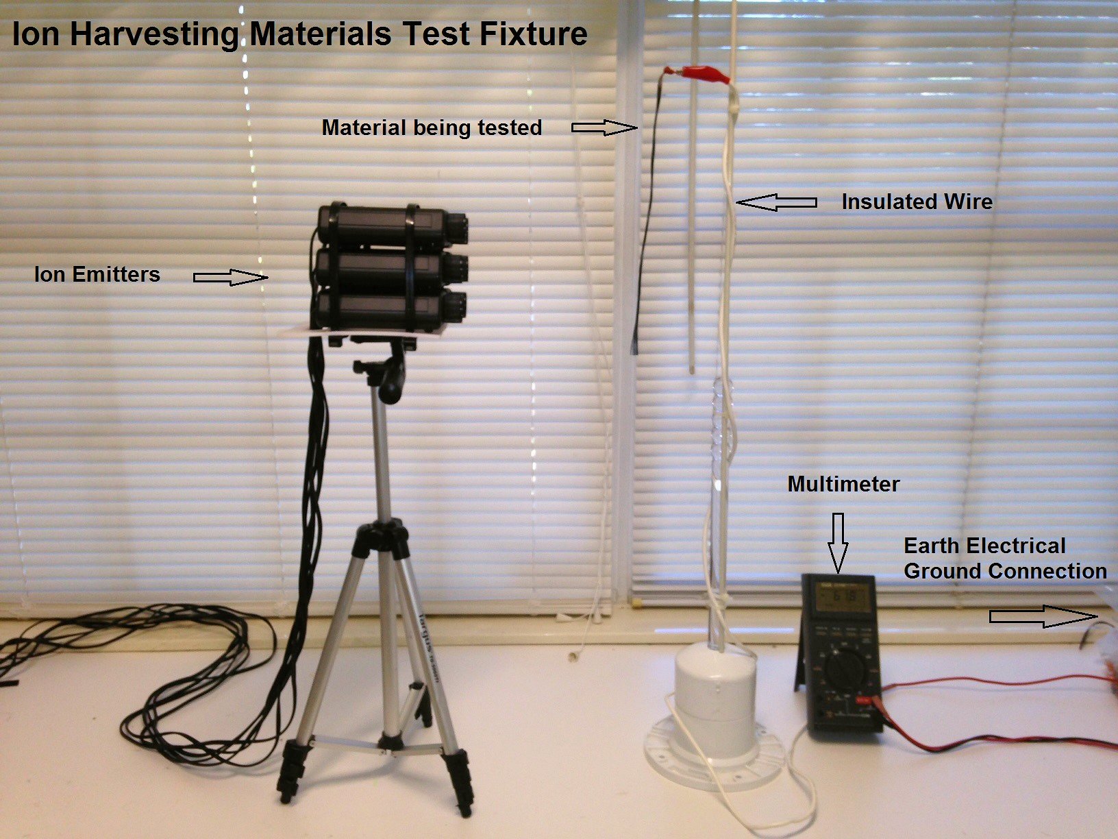 Laboratory testing included measuring many different material’s ability to harvest electrical energy from airborne ions produced by a remotely positioned high-voltage reference ion generator.